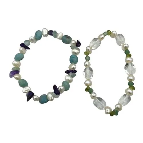 De combinatie van verschillende edelstenen en parels geeft deze armbandjes een elegante, natuurlijke uitstraling. Dankzij het elastiek passen ze om de meeste polsen en zijn ze makkelijk om te doen.