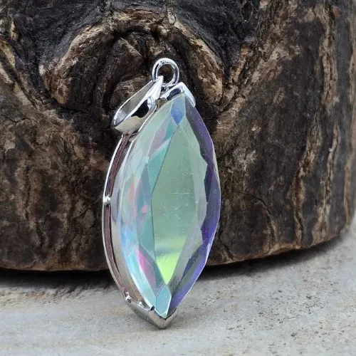Deze elegante hanger van 925 sterling zilver is gezet met een echte topaas die is voorzien van een speciale mystieke coating. Dankzij deze bewerking ontstaat een prachtig iriserend effect, waarbij de steen schittert in wisselende tinten goud/geel, paars en blauw.