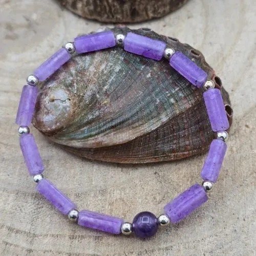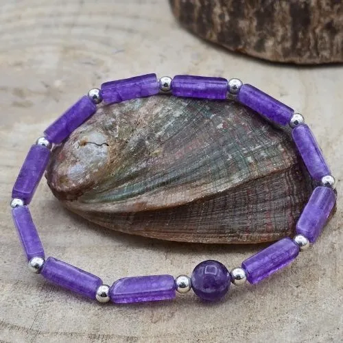 Deze elegante amethist armband combineert ronde kralen van 8 mm met verfijnde amethist staafjes van ca. 4 × 13 mm. De speelse afwisseling van vormen geeft de armband een stijlvolle en unieke uitstraling.