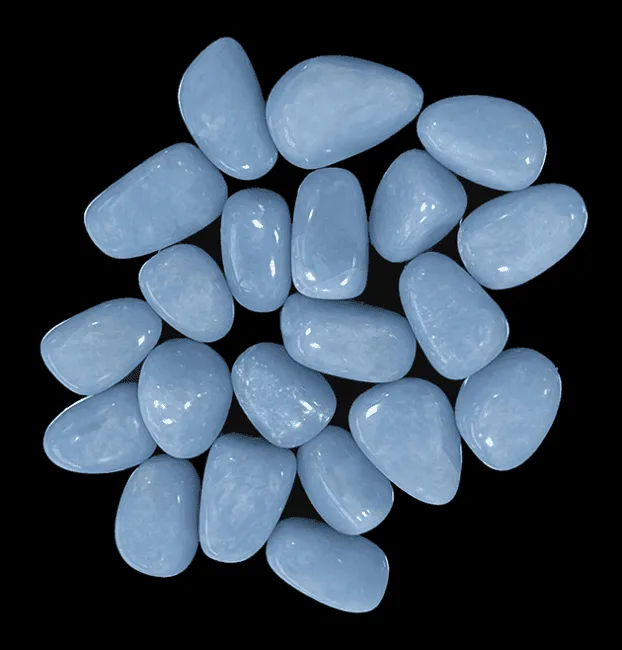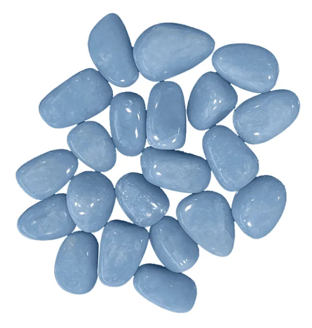 Ontdek de getrommelde Angeliet – een zachte, lichtblauwe edelsteen die bekend staat om haar kalmerende energie en spirituele verbinding. Elk steentje is uniek van vorm en afmeting, met een natuurlijke glans die uitnodigt tot aanraken en voelen.