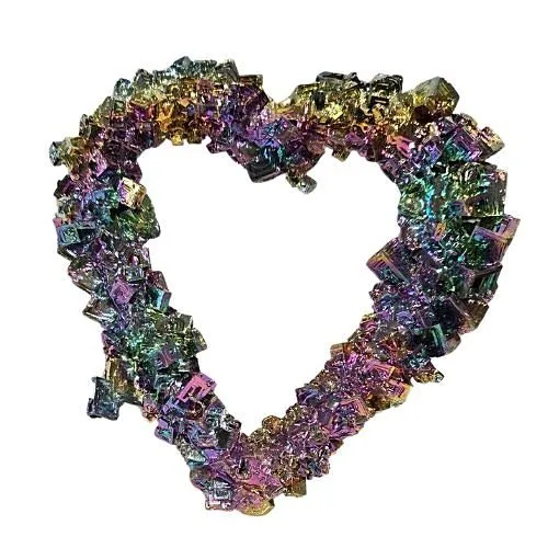 Dit indrukwekkende bismuth hart van ca. 11,5 cm is een bijzonder decoratief object gemaakt van kristallijn metaal. Bismuth staat bekend om zijn unieke trapvormige kristalstructuur en opvallende regenboogkleuren. Tijdens het gecontroleerde afkoelingsproces van het gesmolten metaal ontstaan deze bijzondere geometrische vormen.