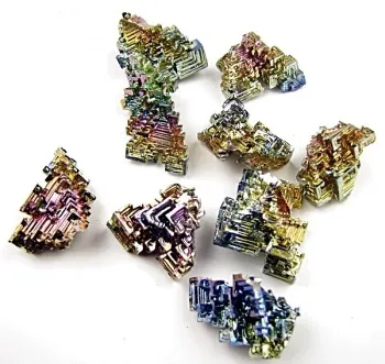 Bismuth stuurt kundalini energie terug naar beneden door het lichaam naar het aardesterchakra, hierdoor versterkt hij je verbinding met universele energieën. Hij kan op ieder chakra gebruikt worden.Bismuth is een zwaar en breekbaar zilverwitte geometrische kristalstructuur die in een laboratorium groeit, dit is een alchemisch proces. In gesmolten bismuth wordt een pijpje geplaats en na zacht blazen koelt het kristal en vormt zich met prachtige kleuren en geometrie. Het geel komt door een laagje oxide waar goud in zit. Dit kristal dat verbonden is met de heilige geometrie helpt ons weer volmaaktheid in alles te zien.