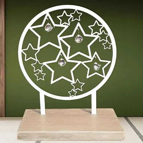 Bij deze cirkel ontvang je 4 regenboogkristalletjes van 2 cm. Aan de sterren zijn subtiele haakjes bevestigd waaraan je de kristallen kunt hangen. Wanneer het zonlicht of kunstlicht erop valt, ontstaat een betoverende schittering met prachtige regenboogreflecties in de ruimte.