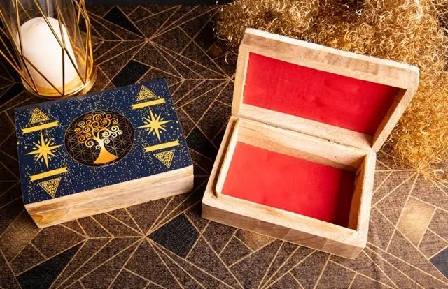 Het hoogwaardige mangohout maakt deze kist stevig en duurzaam, terwijl de epoxyhars zorgt voor een glanzende en afwasbare afwerking. Of je hem nu gebruikt om sieraden, edelstenen, tarotkaarten of andere spirituele voorwerpen in te bewaren – deze kist voegt altijd een vleugje magie toe aan je interieur.