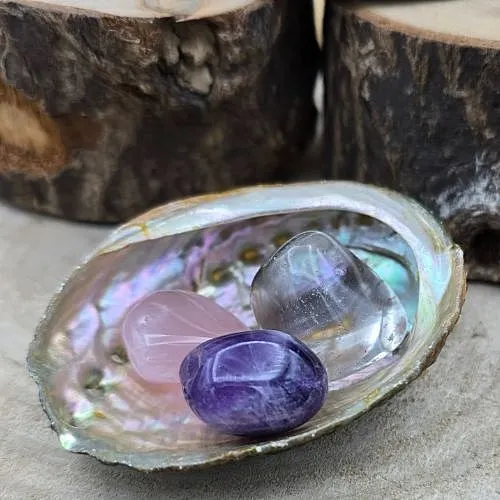 Ontdek de krachtige harmonie van de Gouden Driehoek met onze prachtige Gouden Driehoek Set, compleet met een schitterend mini Abalone schelpje. Dit mini-setje bevat drie getrommelde stenen die samen de magische combinatie vormen van Amethist, Rozenkwarts en Bergkristal.
