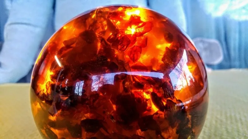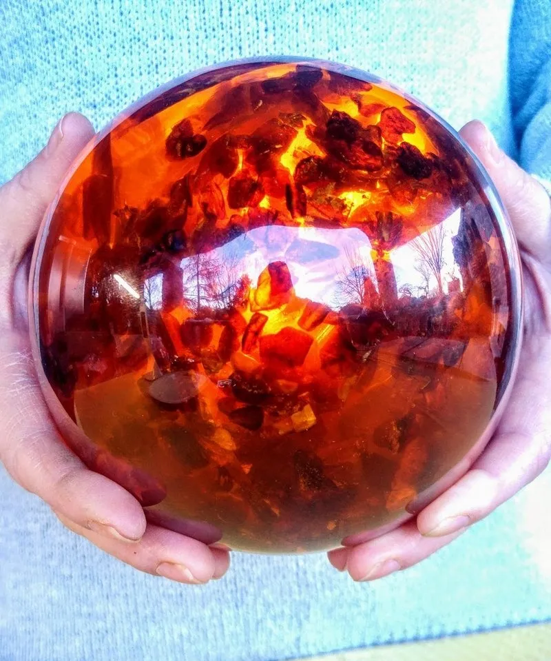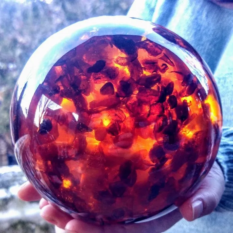 Breng een stukje natuurlijke pracht in je interieur met deze grote Baltische barnsteen bol. Deze schitterende bol combineert 100% natuurlijke Baltische amberstenen met hoogwaardige polymeerhars, waardoor de unieke schoonheid van de stenen optimaal tot zijn recht komt. Onder UV-licht schitteren de natuurlijke amberstukken prachtig, waardoor een magisch effect ontstaat.