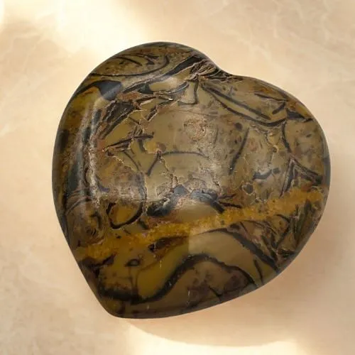 De bijzondere tekeningen in de steen doen denken aan natuurlijke landschappen, wat deze edelsteen een warme en rustgevende uitstraling geeft. Dankzij de hartvorm is deze steen extra geschikt als symbolisch cadeau of als decoratieve edelsteen voor meditatie en energetisch werk.