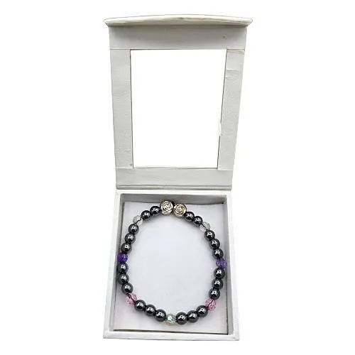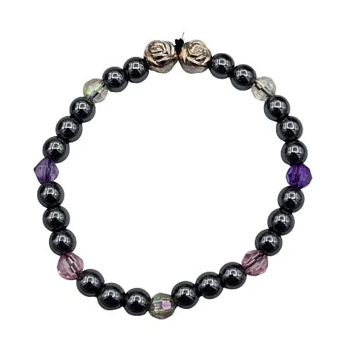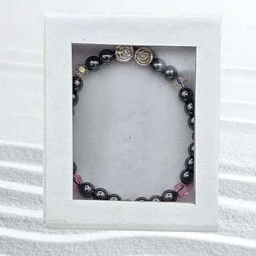 De armband is opgebouwd uit 6 mm hematiet kralen, gecombineerd met roze, witte en paarse gefacetteerde kraaltjes die het licht subtiel laten schitteren. Twee zilverkleurige bloemkralen geven het geheel een verfijnd en romantisch accent.