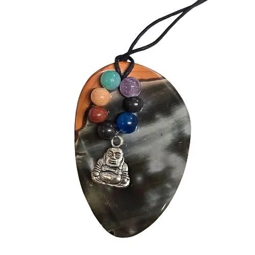 Bijzondere handgemaakte hanger van polychrome jaspis met mooie grijze en warme oranje/rode tinten. De hanger is afgewerkt met kleurrijke chakrakralen en een Boeddha bedel, wat het sieraad een spirituele en harmonieuze uitstraling geeft.