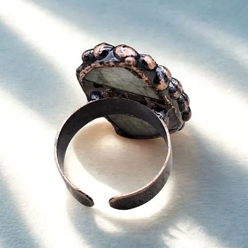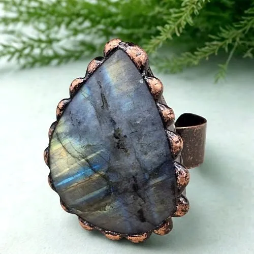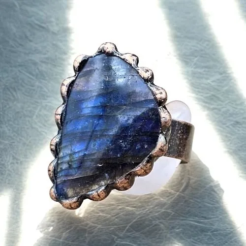 Deze verstelbare koperen ring met labradoriet heeft een unieke en natuurlijke uitstraling. De labradoriet steen is ingelegd in een robuuste koperen zetting en heeft een onregelmatige vorm, waardoor iedere ring een eigen karakter krijgt.