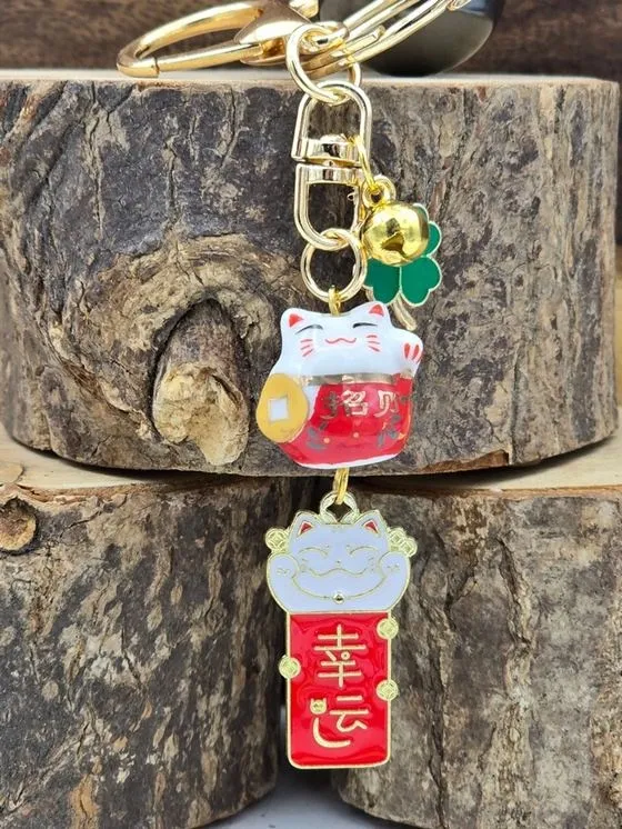 De sleutelhanger bestaat uit een lachende keramische kat met een geluks-klavertjevier, een klein belletje en een decoratief bedeltje dat symbool staat voor voorspoed of blijdschap. Het geheel straalt vrolijkheid en harmonie uit, en past perfect aan je sleutelbos, tas of portemonnee.