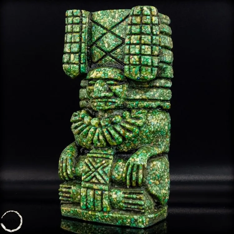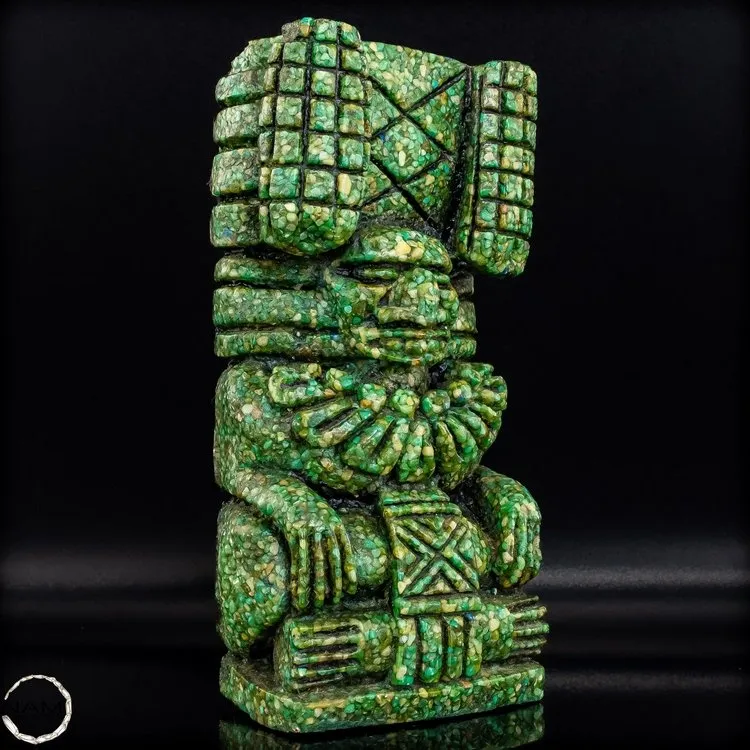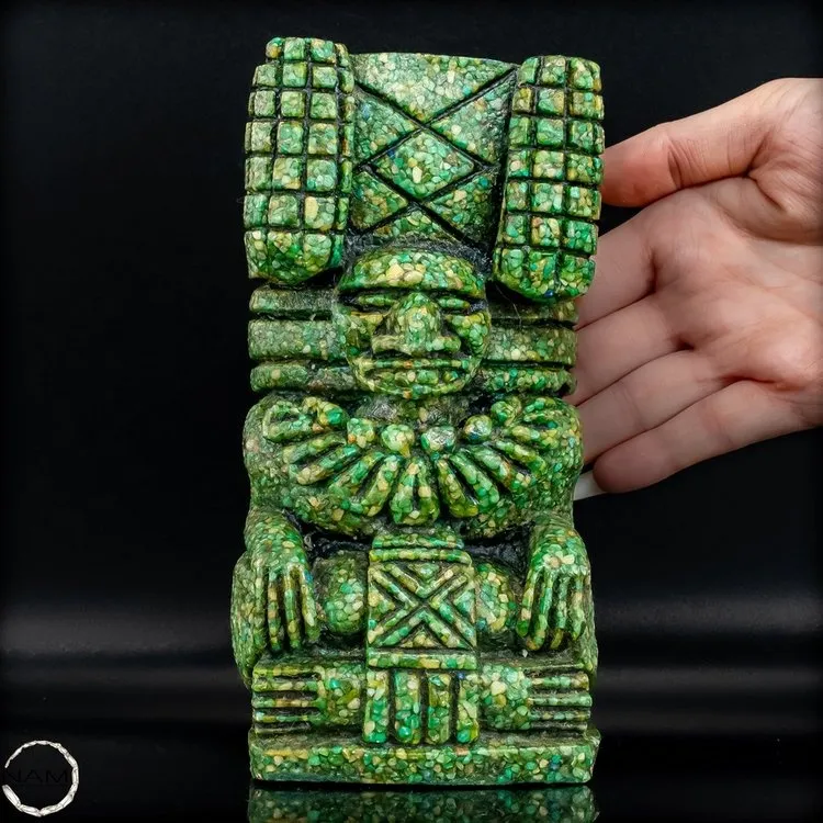 Dit bijzondere malachiet mozaïek beeldje is een waar kunstwerk waarin vakmanschap en natuurlijke schoonheid samenkomen. De sculptuur is opgebouwd uit kleine steensegmenten, waardoor een levendige en unieke structuur ontstaat met diepe groene kleurnuances.