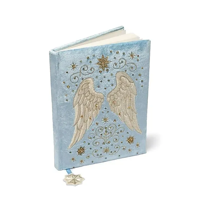 Dit prachtige fluwelen notitieboek met engelenvleugels straalt zachtheid en bescherming uit. De diepe blauwe kaft, verfijnd borduurwerk en subtiele kraaltjes maken dit boekje tot een inspirerend en stijlvol item voor dagelijks gebruik.