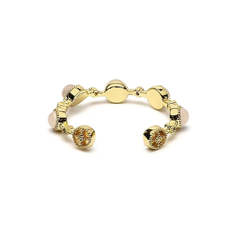Voeg een subtiel en betekenisvol accent toe aan je sieradencollectie met deze Open Ring met zeven rozenkwarts steentjes. De ring heeft een goudkleurige afwerking en een verstelbaar open ontwerp, waardoor hij comfortabel en geschikt is voor verschillende maten. Perfect om te combineren met andere edelsteen-accessoires of als elegant statement-sieraad.