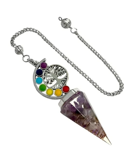 Breng helderheid, bescherming en spirituele balans in je energiewerk met de Orgonite Pendel Amethist – Levensboom & 7 Chakra’s.