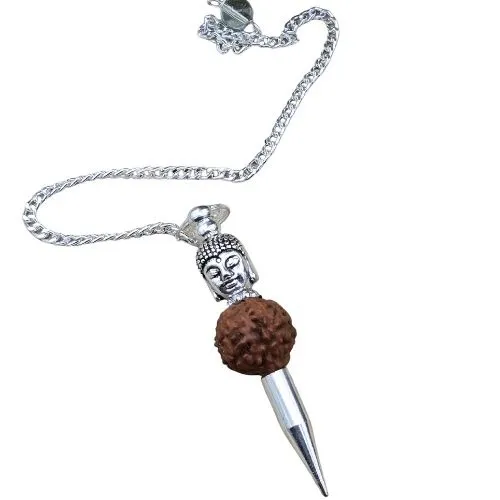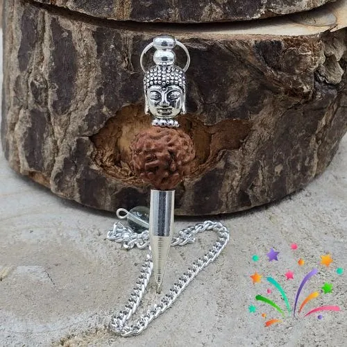 Deze prachtige pendel combineert het heilige Boeddhahoofd en de krachtige Rudraksha-kraal in een uniek ontwerp. Het metaal van de pendel heeft een verfijnde afwerking, en de puntige onderzijde zorgt voor precieze en betrouwbare pendelbewegingen. Deze pendel is niet alleen visueel aantrekkelijk, maar ook spiritueel krachtig door de betekenis van de gebruikte symbolen.
