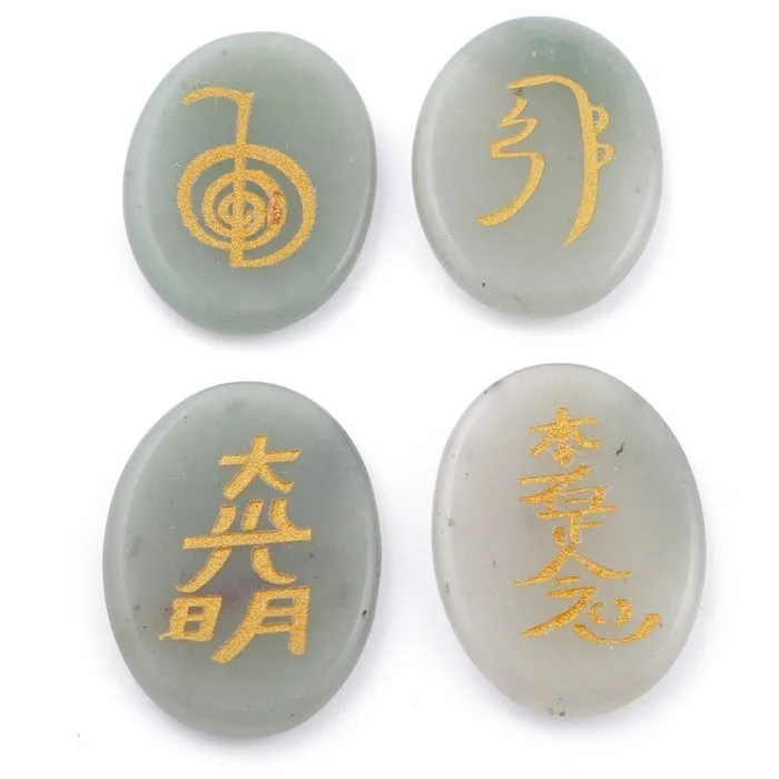 Deze set van 4 ovale groene aventurijn meditatiestenen combineert de zachte, harmoniserende energie van groene aventurijn met de krachtige werking van de vier Reiki-symbolen. Een fijne en ondersteunende set voor meditatie, Reiki-behandelingen, intentiewerk of als liefdevol spiritueel cadeau.