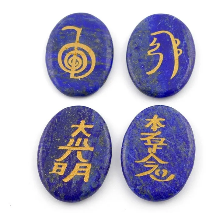 Deze set van 4 ovale lapis lazuli meditatiestenen verenigt de diepe, spirituele energie van lapis lazuli met de krachtige werking van de vier Reiki-symbolen. Een prachtige set voor meditatie, Reiki-behandelingen, intuïtief werk of als bijzonder spiritueel geschenk.