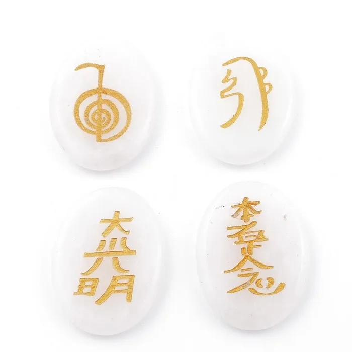Breng je energie in balans met deze prachtige set van 4 Reiki symbool stenen van Rozenkwarts. Elke steen (3 a 4 cm) is gegraveerd met een krachtig Reiki-symbool en met goudverf gekleurd, waardoor ze zowel energetisch als visueel een mooie toevoeging zijn aan je spirituele praktijk.
