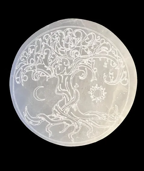 Deze ronde schijf van seleniet is verfijnd afgewerkt met het symbool van de Levensboom. Een bijzondere combinatie van zuiverende energie en diepe symboliek, die rust, harmonie en verbondenheid uitstraalt. Mooi als decoratief object, meditatiesteen of betekenisvol cadeau.