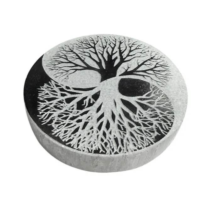 Deze ronde standaard van seleniet is vormgegeven met het symbolische Yin Yang-motief, dat staat voor balans tussen tegenpolen. De zachte, licht doorschijnende glans van seleniet geeft de standaard een rustige en zuivere uitstraling. Ideaal voor het opladen en reinigen van edelstenen, sieraden of kleine spirituele objecten.
