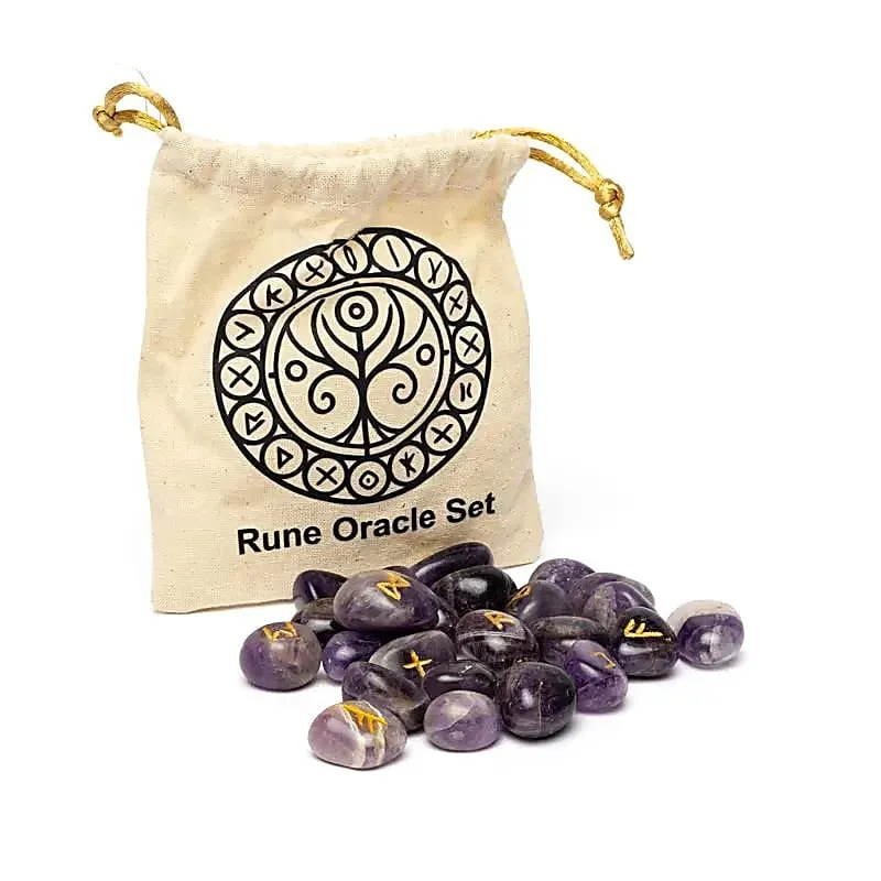 De paarse tint van amethist geeft de set een serene en spirituele uitstraling, terwijl de natuurlijke stenen elke rune uniek maken.