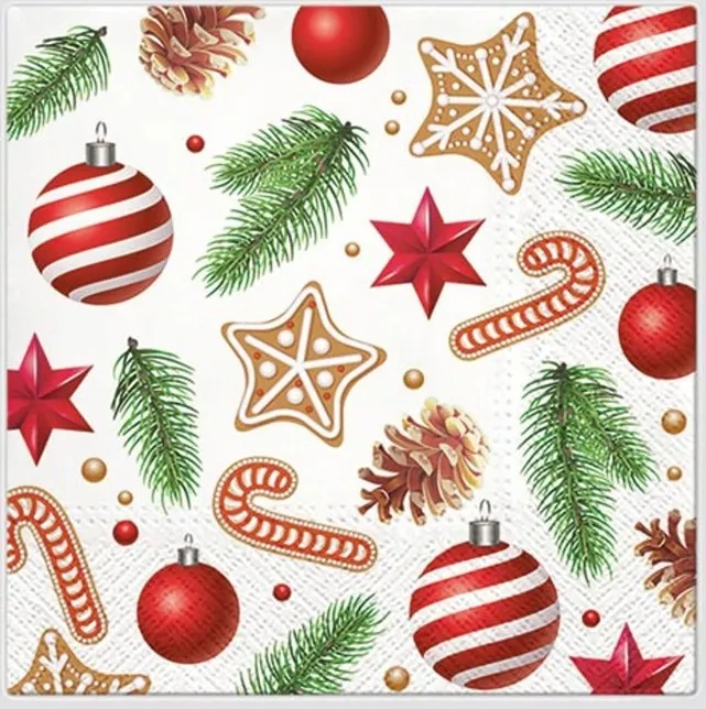 Maak je kerst- of feesttafel compleet met deze stijlvolle servetten met sterren- en ballenmotief. De set bevat 20 servetten van hoogwaardige 3-laags kwaliteit, perfect voor een gezellige en feestelijke tafelsetting.