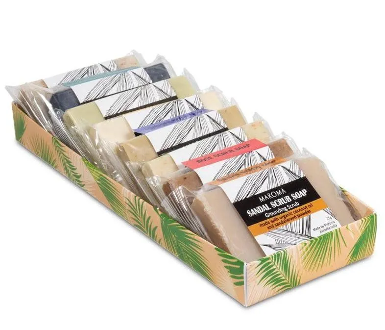 Verwen je huid met deze luxe set van 8 mini scrubzepen van MAROMA. Elke zeep heeft zijn eigen unieke geur en werking, samengesteld uit natuurlijke ingrediënten en verrijkt met essentiële oliën. Perfect voor een zachte exfoliatie en een fris, verzorgd gevoel.