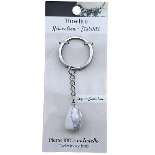 De howliet in deze sleutelhanger is afkomstig uit Zimbabwe en is een natuurproduct. Elke steen is uniek in vorm, structuur en tekening. Kleine variaties horen bij de natuurlijke eigenschappen van howliet en geven iedere sleutelhanger een eigen uitstraling.