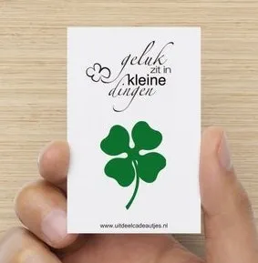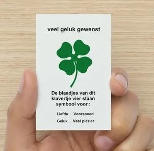 Tekst op kaartje: De blaadjes van dit klavertje vier staan symbool voor geluk,liefde,voorspoed en veel plezier
