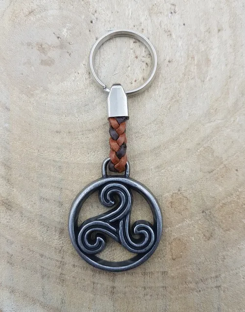 Deze stijlvolle sleutelhanger met het Triskel-symbool combineert krachtige symboliek met een robuust en tijdloos ontwerp. Het gedetailleerde metalen symbool is bevestigd aan een gevlochten leren band, wat zorgt voor een stoere en elegante uitstraling.
