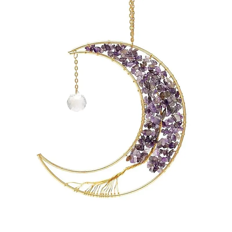 Breng een vleugje mystiek en sereniteit in je interieur met deze prachtige Suncatcher Maan met Amethist & Levensboom. De halvemaanvormige hanger is met de hand vervaardigd uit koperkleurige draad en versierd met kleine stukjes amethist, die een zachte paarse gloed toevoegen. De facetgeslepen kristalhanger vangt het zonlicht en laat het dansen in sprankelende weerkaatsingen – een betoverend spel van licht en energie.