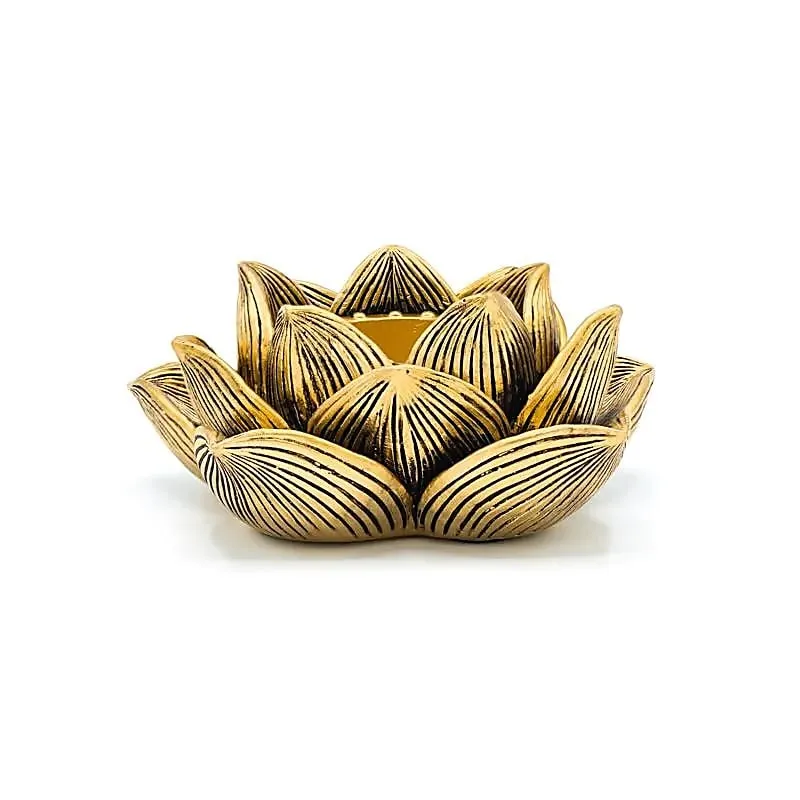 Deze elegante goudkleurige theelichthouder in de vorm van een lotus brengt een rustige en inspirerende sfeer in iedere ruimte. De lotus staat in veel spirituele tradities symbool voor innerlijke groei, zuiverheid en spirituele ontwikkeling. Wanneer een theelichtje brandt in deze houder ontstaat een warm en zacht licht dat een gevoel van harmonie en ontspanning creëert.