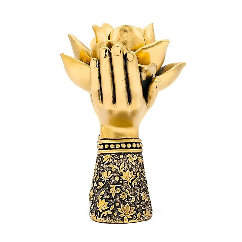 Deze bijzondere goudkleurige theelichthouder toont twee handen die een lotus bloem dragen. De lotus staat in veel spirituele tradities symbool voor innerlijke groei, transformatie en spirituele ontwikkeling. Wanneer je een kaarsje brandt, ontstaat er een warme en rustgevende sfeer die uitnodigt tot meditatie en ontspanning.