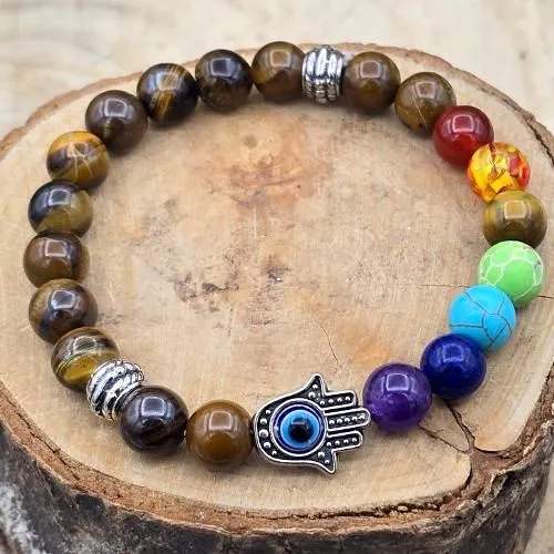 Tijgeroog is een krachtige beschermsteen die helpt bij het versterken van zelfvertrouwen, moed en doorzettingsvermogen. De chakra kralen ondersteunen het in balans brengen van de energiecentra in het lichaam. Het Handje van Fatima – ook wel Hamsa genoemd – staat bekend als symbool voor bescherming tegen negatieve energie en het aantrekken van geluk.