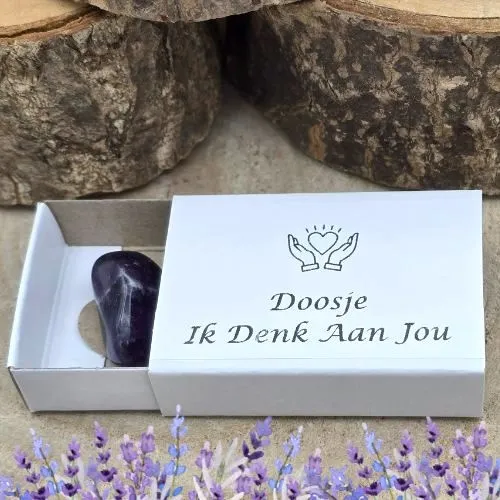 Laat je dierbaren voelen dat ze in je gedachten zijn met dit bijzondere wensdoosje. Het doosje bevat een Amethist edelsteentje, dat bekend staat om zijn kalmerende en troostende eigenschappen, en biedt op die manier een subtiele manier om steun en liefde te geven.