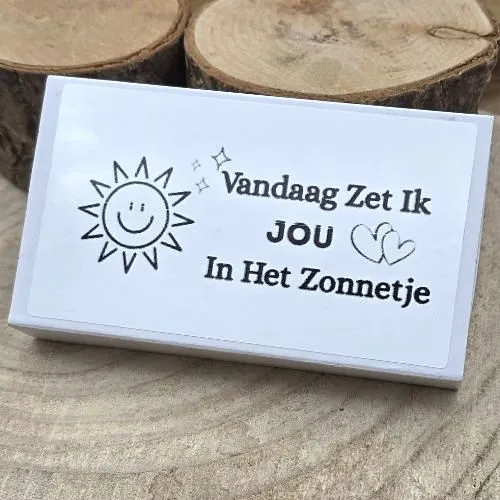 Afmetingen: ca. 11 x 6 cm. Op het doosje staat dezelfde vrolijke tekst “Vandaag zet ik jou in het zonnetje”, waardoor het een perfect klein gebaar is om iemand een zonnig gevoel te geven.
