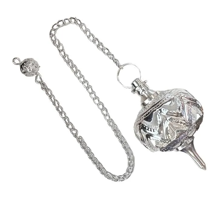 Voeg stijl, focus en energie toe aan je spirituele oefeningen met deze zilveren messing opengewerkte bolvormige pendel – een elegant en krachtig instrument voor iedereen die werkt met energie.
